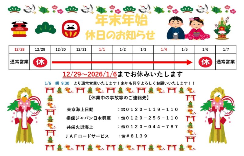 また、休業期間中にお車のトラブルや事故などが発生した場合には、下記の連絡先をご利用ください🚗