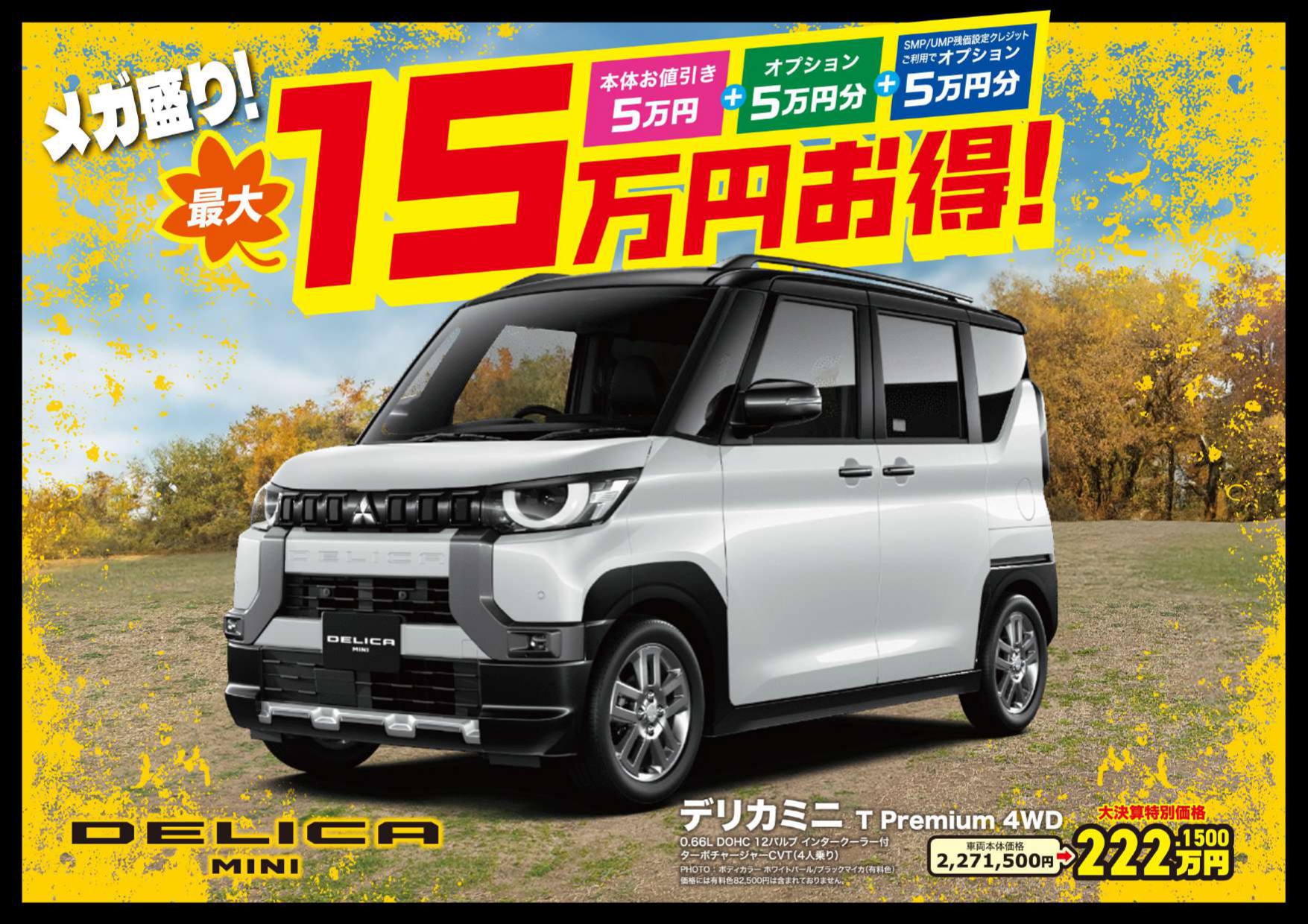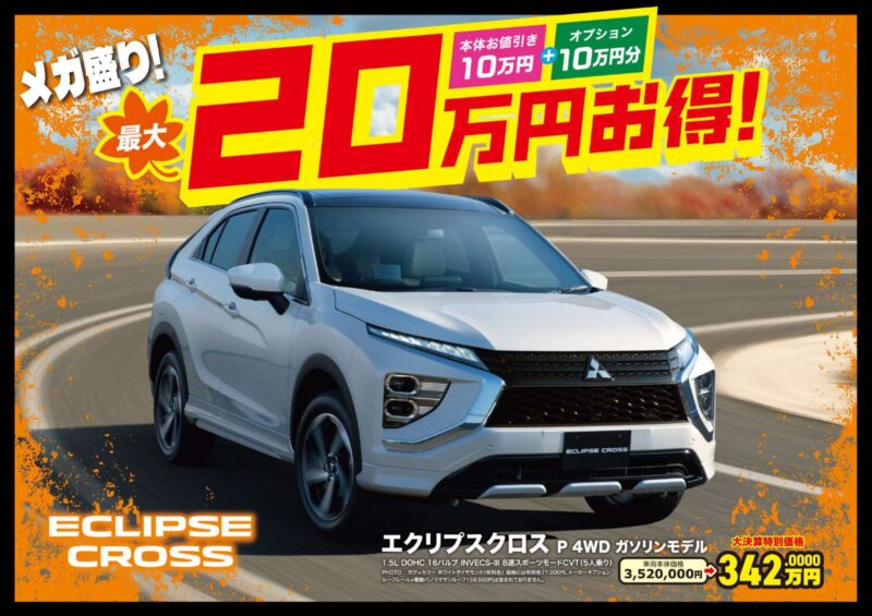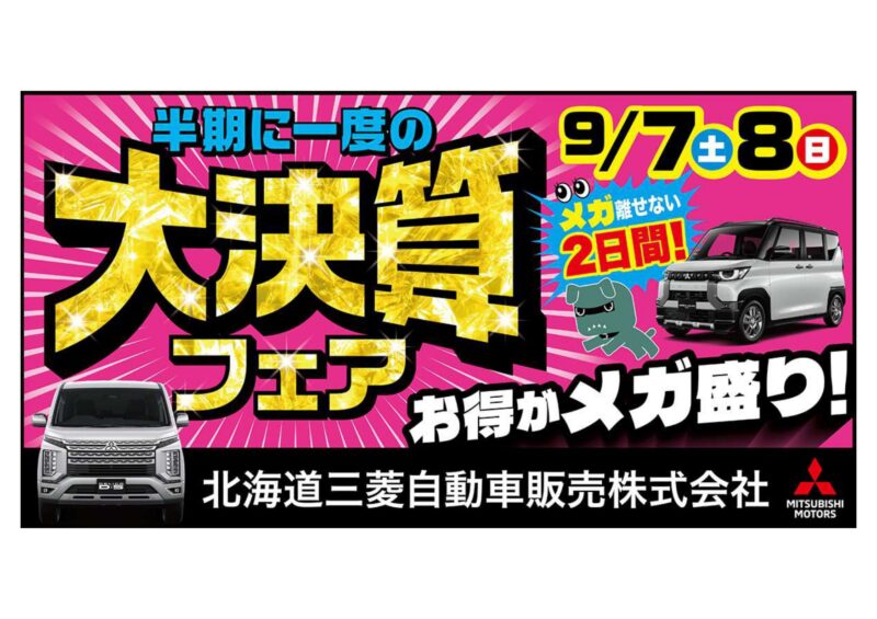 北北海道三菱編集局2024年9月7日・8日 大決算フェア開催! キャンペーン 202408 /30 メガ離せない2日間!2024年9月7日(土)・8日(日)は半期に一度の大決算フェアを開催!新車・中古車のご成約プレゼントはもちろん、ご来店プレゼントもご用意してあります!