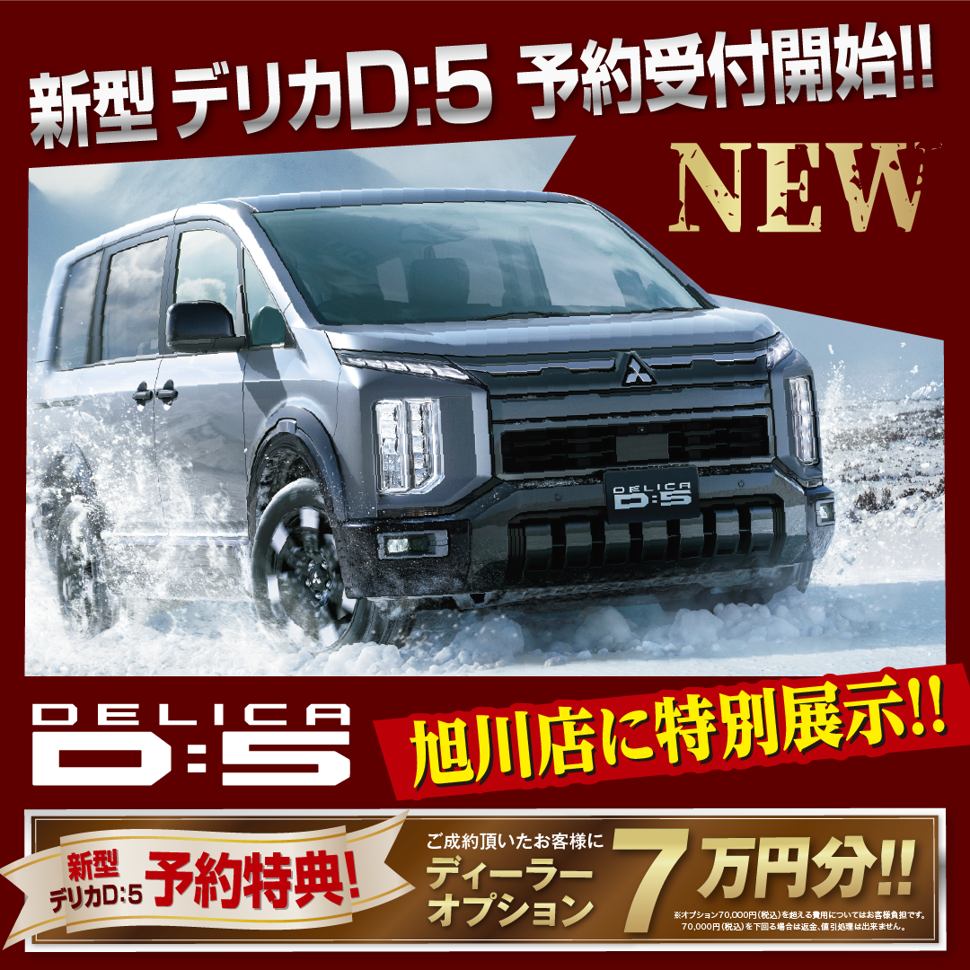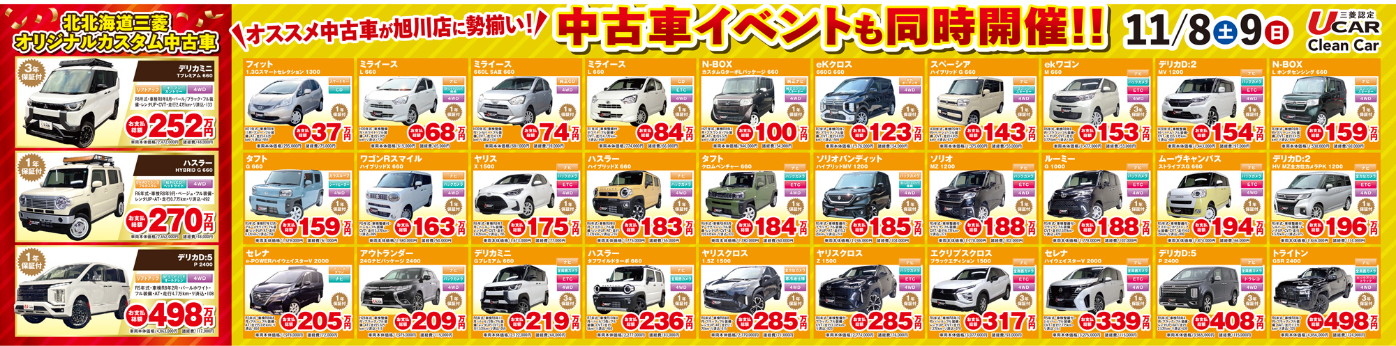 北北海道三菱編集局11/8(土)・9(日) 秋のBIGフェア開催 イベント 202511 /03 旭川店を特設会場として秋のBIGフェアを開催!11/8(土)・9(日)は旭川店へGo! ご来店・ご成約プレゼントをご用意! さらにイベント盛り沢山! その1 キッチンカーがやってくる! その2 アウトドア系カスタムカーが大集合! その3 新型デリカD5を特別展示! 中古車イベントも同時開催!! オススメ中古車が旭川店に勢揃い! 2025.09.01 9/6(土)7(日)の2日間『決算BIGFAIR』開催 9/6(土)、7(日)の2日間、半期に一度の大勝負!! 決算BIGFAIRを開催いたします。 豪華なご成約プレゼント、ご来店プレゼントをご用意して、お待ちしております! ... 2025.08.23 新型デリカミニ 2025年秋デビュー 「デリカミニ」が2025年、秋にさらなる進化を遂げ、ニューモデルとして生まれ変わる!新型デリカミニの進化のポイントや予約注文特典の情報などをご紹介。 ... 2025.08.01 中古車ご成約で5万円分オプションプレゼント プレゼント内容 2025年8月1日〜9月24日の期間中に中古車をご成約いただくと、オプション5万円(消費税込)以上ご注文の場合、5万円(消費税込)をお値引き致します。取付工賃は別途申し受けます。 ... 2025.08.01 夏季休業のお知らせ 夏季休業のお知らせ 毎々格別のお引き立てを賜わり厚くお礼申し上げます。 お客さま各位にはご不便をおかけいたしますが、誠に勝手ながら、下記期間中は夏季休業とさせていただきますので、ご了承のほど何卒よろし... More