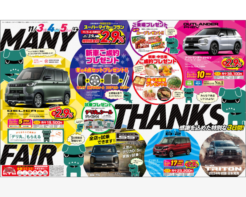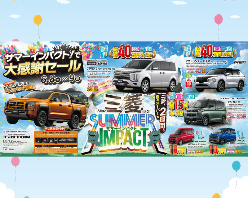 Kita Hokkaido Mitsubishi News 北北海道三菱編集局 :イベント 2025.11.03 11/8(土)・9(日) 秋のBIGフェア開催 旭川店を特設会場として秋のBIGフェアを開催!11/8(土)・9(日)は旭川店へGo! ご来店・ご成約プレゼントをご用意! さらにイベント盛り沢山! その1 キッチンカーがやってくる! その2 ... 2025.07.18 旭川オールディーラー 新車フェア 7月19日(土)・20日(日)開催 年に一度、旭川のディーラー16社が大集結! 今週末は、是非、道北アークス大雪アリーナへ皆さん揃ってお越し下さい! ... 2025.06.19 旭川オールディーラー 中古車セレクション 6月21日(土)・22日(日)開催 年に一度、旭川のディーラー15社が大集結! 今週末は、是非、ベストム駐車場特設会場へ皆さん揃ってお越し下さい! ... 2025.04.18 2025年度 入社式が開催されました 2025年4月1日。春の柔らかな陽光に包まれながら、株式会社D&Dホールディングスグループの入社式が厳かに執り行われました。 会場には、北北海道三菱自動車販売の新入社員3名が、晴れやかな面持ち... 2025.01.28 旭川・買物公園内「旭川はれて屋台村」にてトライトン絶賛展示中 杉村太蔵氏が代表を務められている旭川・買物公園内「旭川はれて屋台村」にて、トライトンが絶賛展示中です 杉村太蔵氏からの熱いメッセージを下記YouTubeよりぜひご清聴いただければと思います。 ... 2025.01.05 1/11(土)・12(日)・13(祝)は初売りフェア 1/11(土)・12(日)・13(祝・月)は、お得ヘビー級で巳どころいっぱいの新春初売りフェアを開催!選べるご来店・ご成約プレゼントご用意しました! ... 2024.12.23 「旭川はれて屋台村」に車両展示しております(12/28(土):杉村太蔵氏主催のセレモニー実施します) 杉村太蔵氏が代表を務められている旭川・買物公園内「旭川はれて屋台村」にて、約3か月間車両展示を行います(既にトライトン展示中です)。つきましては下記日程でセレモニーを行いますので、皆様お誘い合わせの上... 2024.05.31 2024年6月8日・9日 SUMMER IMPACT大感謝セール開催! 三菱、夏のスーパーな2日間!2024年6月8日(土)・9日(日)はSUMMER IMPACT大感謝セールを開催!新車・中古車のご成約プレゼントはもちろん、ご来店プレゼントもご用意してあります! ... 2024.02.19 2024 超決算カーニバル 3/2(土) 3/3(日)開催! 2024年3月2日(土)・3日(日)は、超決算カーニバルを開催!ぜひこの機会にお近くの店舗へご来店ください! ... 2023.10.31 11/3・4・5はMANY THANKS FAIRの感謝を込めた特別な3日間! 11/3(金)・4(土)・5(日)は、日頃のご愛顧に感謝して、ご来場プレゼントに新車・中古車ご成約プレゼント、試乗プレゼントをご用意した特別な3日間です。ぜひこの機会にご来店くださいませ! ... 2023.05.07 旭川オールディーラー新車フェア2023 4年ぶりにディーラー15社が大集結!! 一度に最新の車をみられるのは本フェアだけ!!! 是非、道北アークス大雪アリーナ特設会場へ皆さん揃ってお越し下さい! イベント特設サイトはこちら → ... 2022.07.04 7/9(土)・10(日) 中古車 BIG FAIR開催 7/9(土)・10(日)10:00-17:00の2日間、アルティモール東神楽にて三菱とHondaの中古車が一挙に100台以上大集結する北北海道三菱自動車・Honda Cars 旭川・Honda Ca... 2020.11.04 11/7(土)・8(日)は三菱U-CAR大商談会 in 旭川地場産センター 11月7日(土)・8日(日)の2日間は旭川地場産業振興センターにて、 エリア最大級おすすめ中古車一挙80台を展示するU-CAR大商談会を開催! ご来場プレゼント・ご成約特典、各種おもてなしをご用意し... 2020.05.07 7月11日(土)・12日(日)夏祭り開催! 7月11日(土)・12日(日)の2間間限りの夏祭りを開催❗️ もらって嬉しい😍ご試乗プレゼント・ご来場プレゼント・ご成約プレゼントをご用意いたしました❗️ ... 2020.05.02 総決算!旭川店・神居店にて9月5日・6日は史上最大の大商談セール開催! 総決算につき、9月5日(土)・6日(日)は、旭川店・神居店にて2間間限りの史上最大の大商談セールを開催いたします❗️ もらって嬉しい😍ご来場抽選プレゼント・ご成約プレゼントをご用意いたしました❗️ ぜ... 2020.05.02 空知店リニューアルオープン1周年記念・感謝セール 9月で空知店はリニューアルオープンしてから1周年を迎えます❗️ この感謝・感動に、プライスもサービスも全力でおもてなしさせていただく2日間の感謝セールを開催させていただきます❗️ ご来場抽選プレゼント... 2020.02.10 eK Space / eK X Space 先行展示会開催 新型eK Space / eK X Space の展示車両を各1台ずつ確保できる運びとなりましたので、以下の日程にて北北海道三菱自動車各店舗での先行展示会を開催いたします。ぜひこの機会にお時間のあると... 2019.11.22 U-CAR 大商談会 2019年11月23日/24日の2日間 北北海道三菱では、2019年11月23日(土曜日)と24日(日曜日)の2日間に渡りUCAR大商談会を実施いたします。皆様のご参加をお待ちしております! U-CAR タイムセール 開催日時 11月23日... 2019.10.11 おすすめ中古車一挙80台 U-CARダイナマイトフェア開催 10/12(土)-13(日) 10月12日(土)・13日(日)は旭川地場産業振興センターにて、 エリア最大級おすすめ中古車一挙80台を展示するU-CARダイナマイトフェ